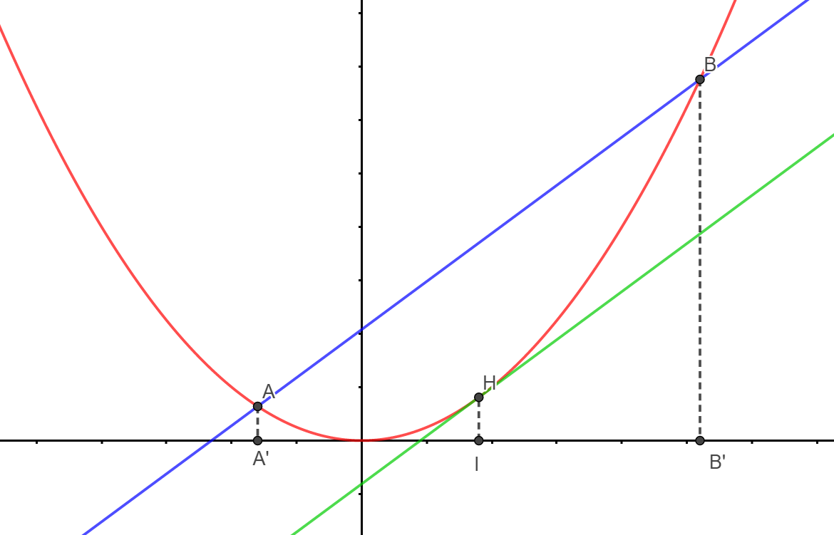 On considère les points \(A(a ;a^2)\) et \(B(b ;b^2)\) appartenant à la parabole \(\mathscr P\) avec \(a,\,b\in\mathbb R\).