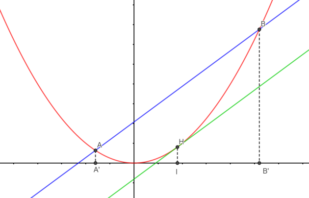 Au point d'abscisse \(\color{red}H(1 ;f(1))=(1 ;1)\), la tangente est parallèle à \((AB)\).