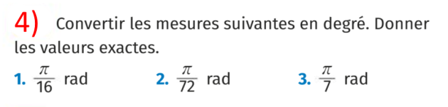 \(\frac{\pi}{72}\text{ rad }=\frac{5}{2}^{°}=2,5^{°}\)