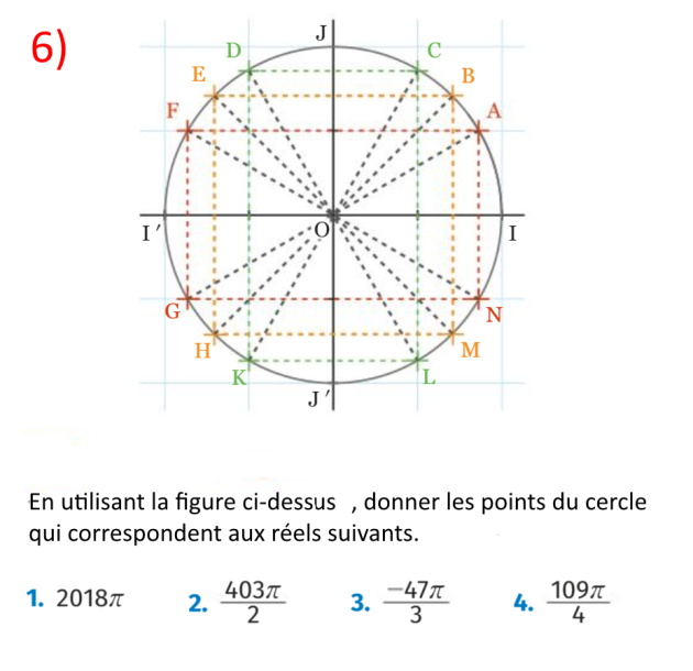 \(\frac{109\pi}{4}-14\times2\pi=\color{red}-\frac{3\pi}{4}\) correspond donc au point \(\color{red}H\)