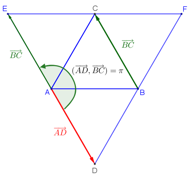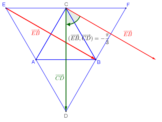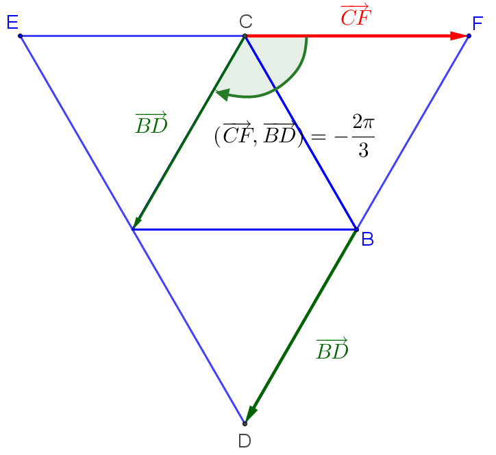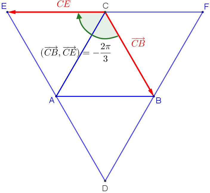 \((\overrightarrow{CB};\overrightarrow{CE})=(\overrightarrow{CB};\overrightarrow{CA})+(\overrightarrow{CA};\overrightarrow{CE})=-\dfrac{\pi}{3}-\dfrac{\pi}{3}\color{red}\underline{~=-\dfrac{2\pi}{3}}\) (figure[3])